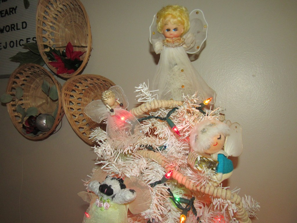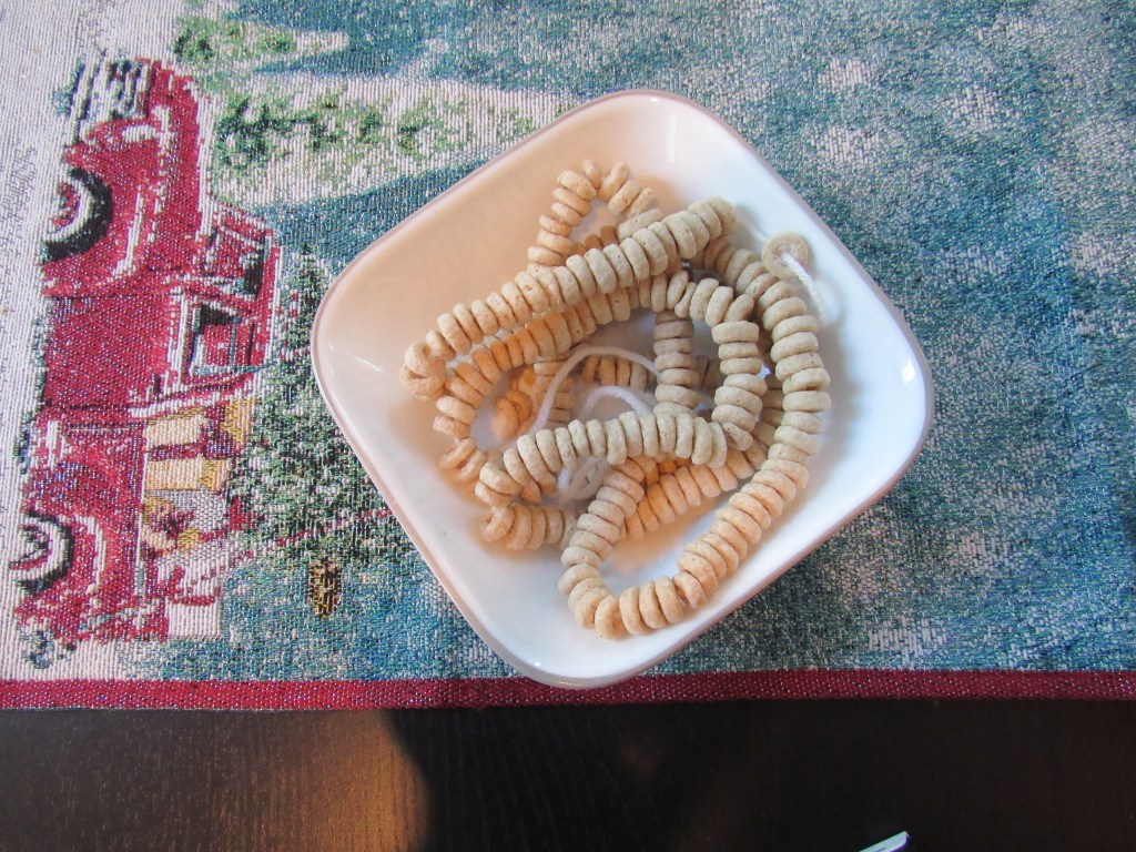 Besides the clear-bulbed natural tree in the front room of our home, there is a second tree downstairs in the family room just for the kids (yes, we’re those multiple-tree having people!). It’s a very small, artificial tree trimmed with vintage angel ornaments collected by my mother and daughter. With it’s white branches and colorful bulbs I thought it could use a touch of handmade charm in the form of yarn strung Cheerios garland.